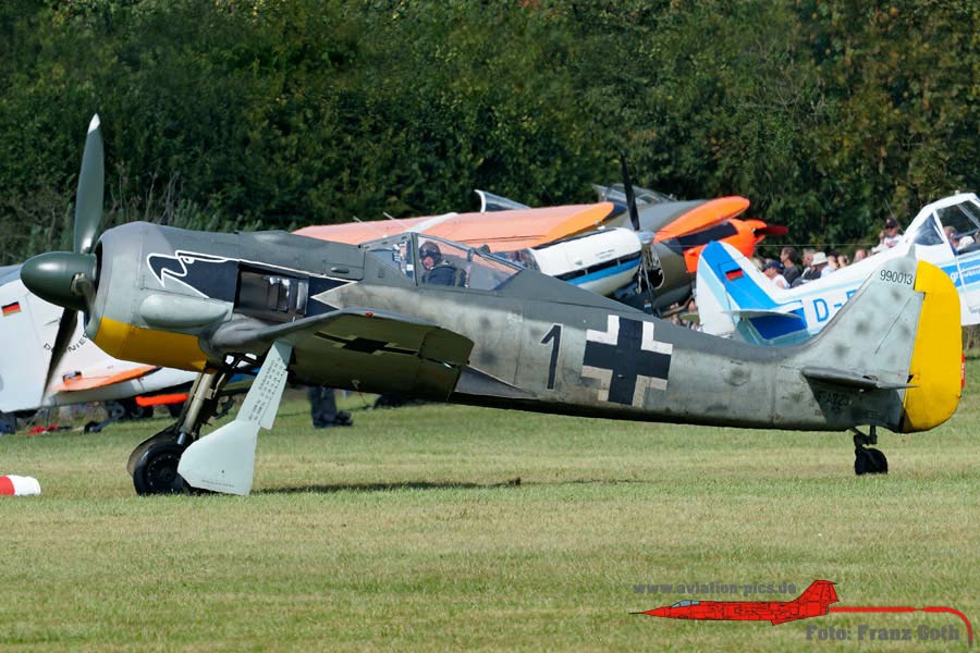 In den Farben der Fw 190A-4, W.Nr. 734, Schwarze 1, geflogen von Oberleutnant Horst Hannig, Staffelkapitan der 2./JG-2 "Richthofen, Triqueville (Frankreich) 1943, Erstflug im Mai 2009, Zulassungsnummer F-AZZJ.